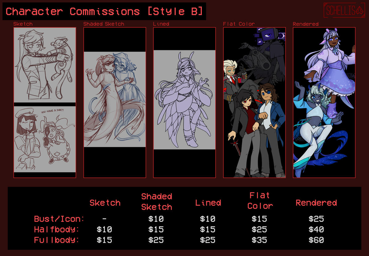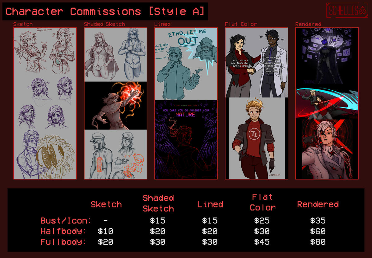 HOW TO ORDER:Feel free to order from my VGen or through the Form.Vgen has a more basic form & is currently only available for Style A works + customs, but if you have something more complicated in mind, please use the google form, email me ([email protected]), or use the "Custom Inquiries" section on Vgen . :]If you have any questions, feel free to email me or contact me at any of the social medias in the buttons above, or through Discord (dragon_schellis)